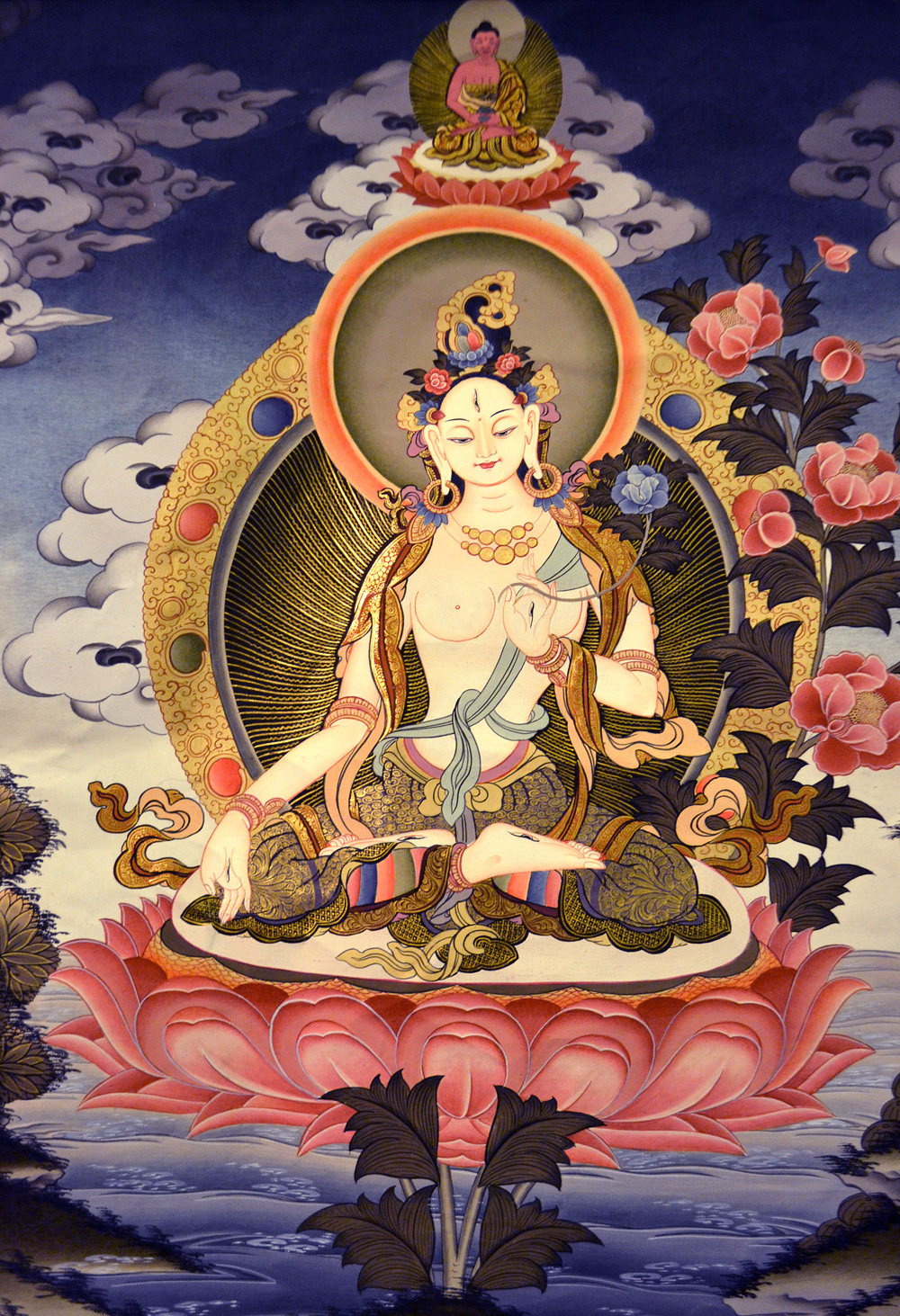 White Tara is the main female Bodhisattva, traditionally associated with the lotus. White Tara in Vegetka is displayed in the lotus position with seven eyes (the eyes, forehead, hands and feet), symbolizing the vision of all the earth, and the ability to help all feeling beings. Photo: Barbora Sajmovicova