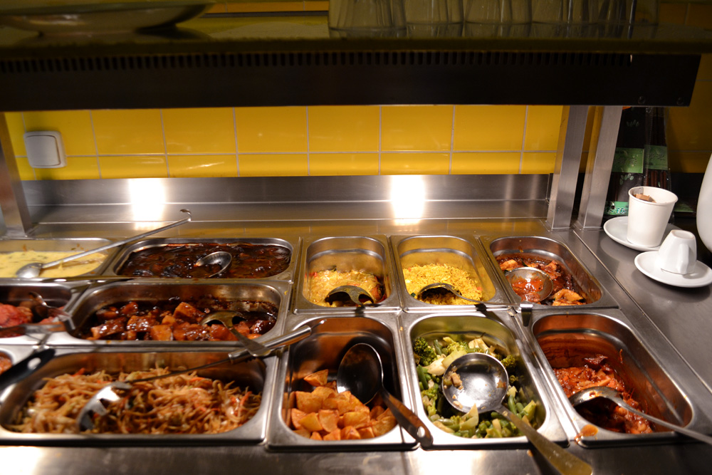 Self-service counter with warm vegan meals in Vegetka. Photo: Barbora Sajmovicova, 2016, Prague.